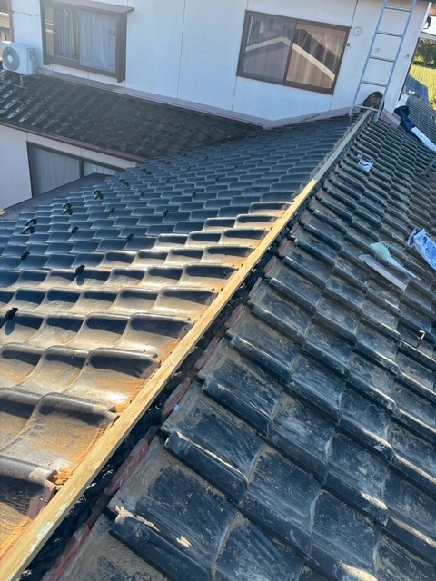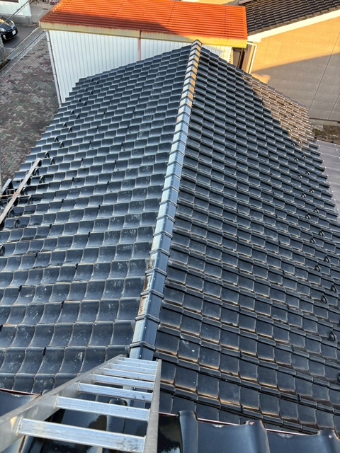 廊下からの漏水で点検したところ、「棟瓦」のずれが原因でした。瓦屋根は耐久性に優れているとされていますが、定期的な検査とメンテナンスが欠かせません。特に注意が必要なのは、屋根の最頂部に位置する「棟瓦」です。屋根の最も高い位置にある棟は、損傷を受けやすい箇所です。劣化が進行すると、「棟瓦の再施工」が必要となる場合があります。棟瓦の劣化を放置すると、台風や地震などの自然災害時に深刻な被害を受ける可能性が高まります。そのため、早期の対応が重要なのです。